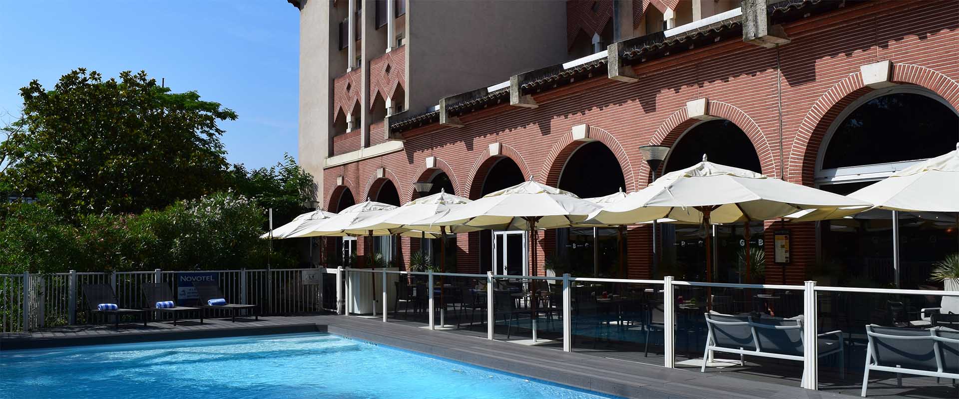 Lieu de tournage - L'espace terrasse et piscine du Novotel de Compans