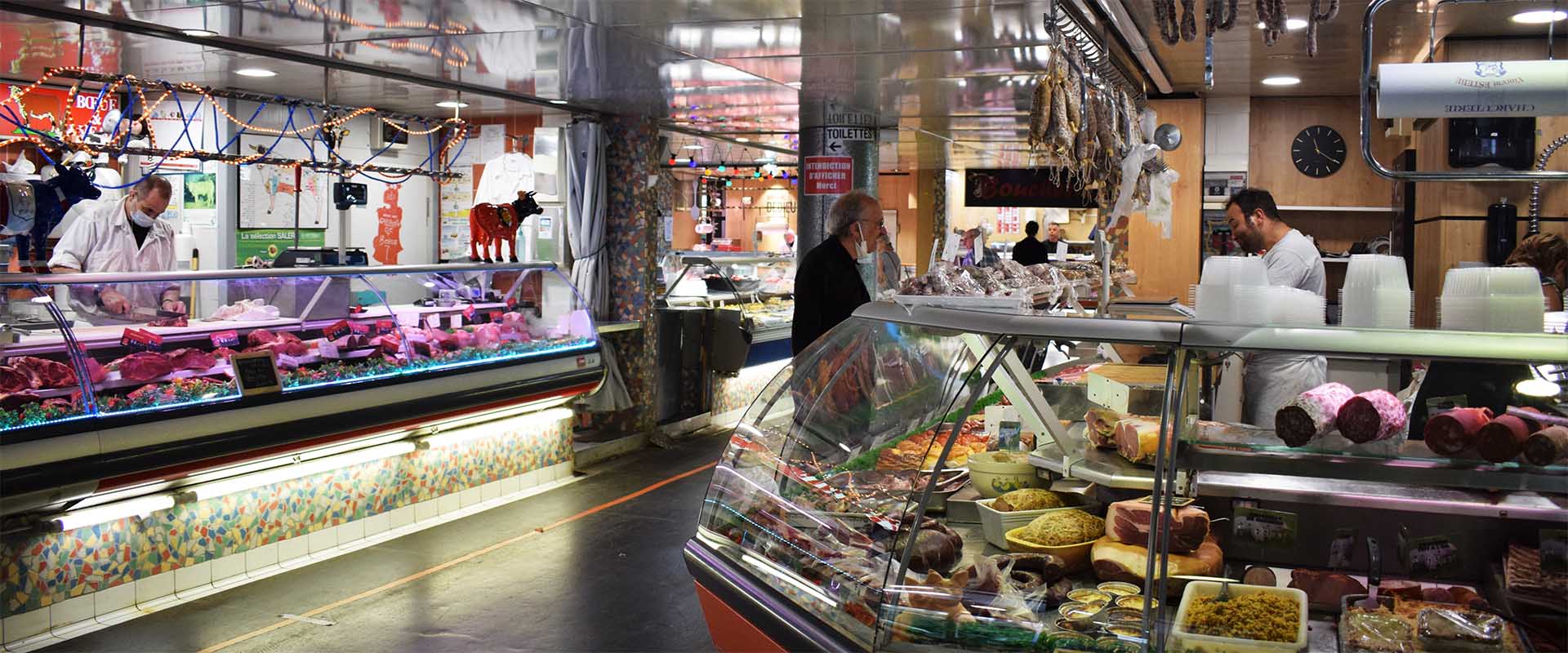 Les loges lumineuses de la halle abritent des produits frais et locaux (légumes, viandes, pains, etc.).