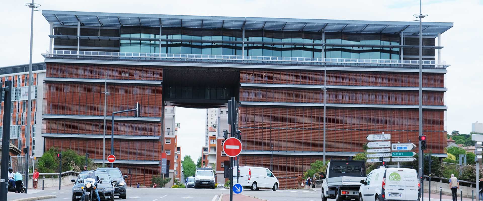 En forme d’arche asymétrique, le bâtiment est composé de deux volumes reliés dans les airs par un belvédère qui offre un panorama sur la ville et répond à la place Wilson.