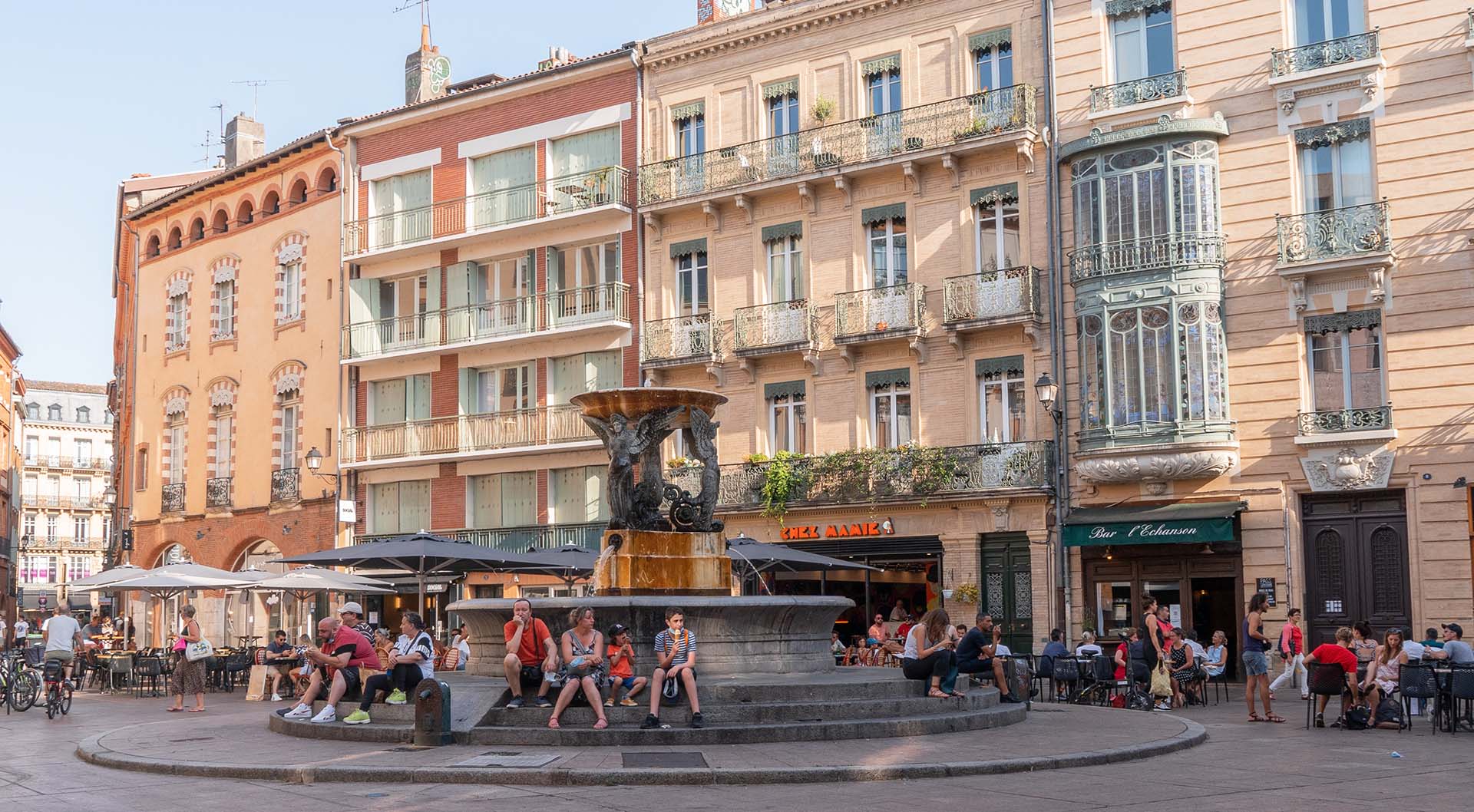 L’immeuble Lamothe, en brique en arrière-plan de la fontaine est décoré de statues à l’antique. La façade a été pensée comme une mise en scène architecturale qui souligne la beauté de la fontaine.