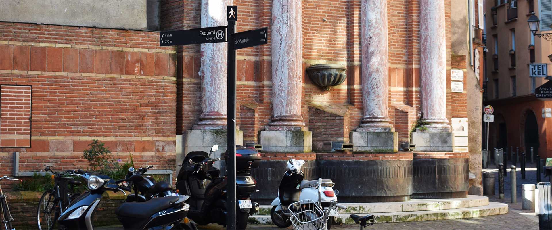 La fontaine est installée en 1984 pour orner une façade aveugle. L’architecte Bernard Calley exalte ainsi les richesses du patrimoine artistique toulousain dans une conception post-moderne : la mémoire du passé est réhabilitée. Il réutilise donc des colonnes de marbre rose provenant du retable de l’église de la Dalbade datant du 18ème siècle. Il y ajoute trois puits habillés de cuivre.